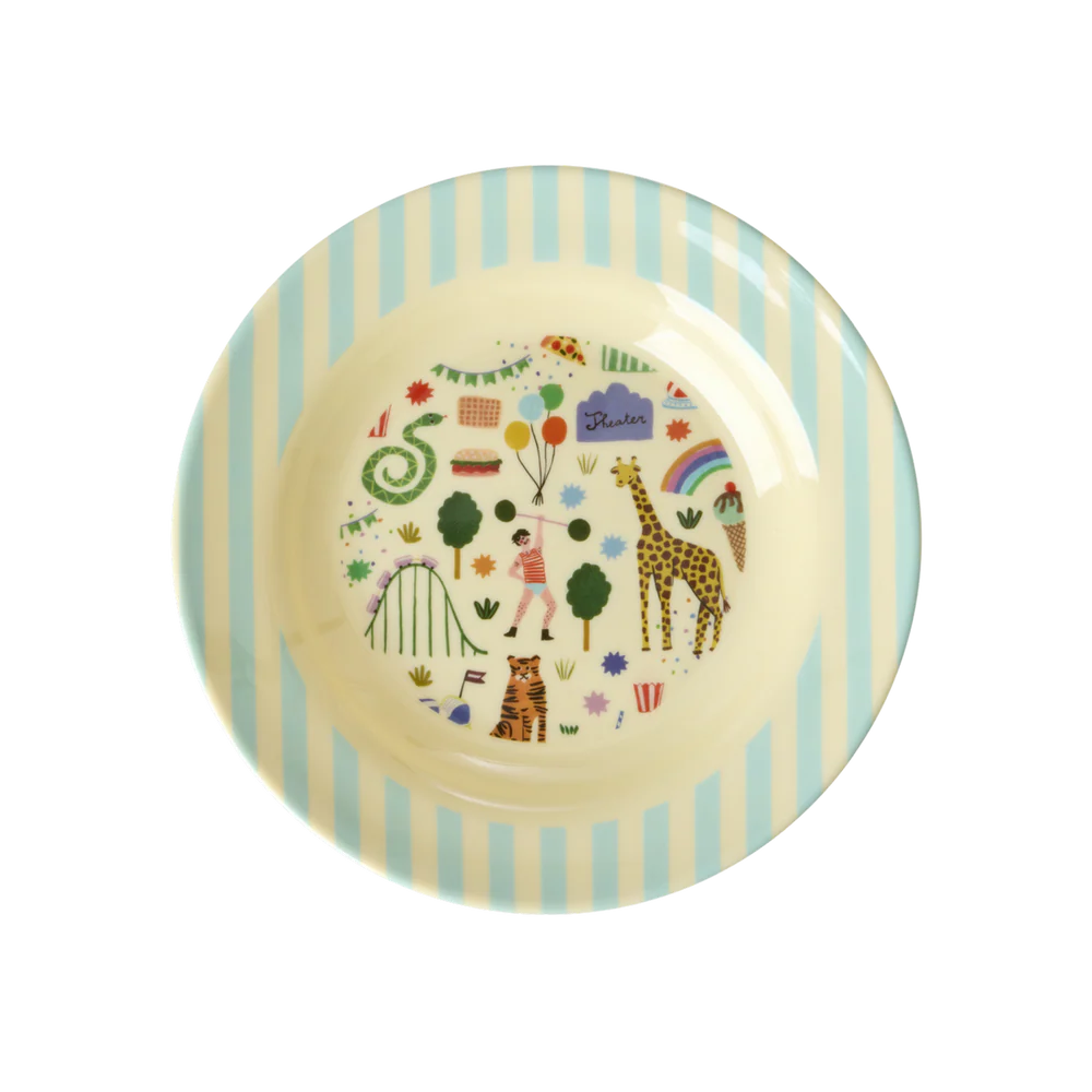 Super sød børnemelaminskål med ”Fun Fair” print i blå nuancer. Melamin er holdbart og ideelt til daglig brug pga. dets styrke og lette rengøring. Det absorberer ikke farve eller smag fra maden, hvilket gør skålen praktisk til lidt af det hele – både inden- og udendørs! Vær opmærksom på, at produktet ikke er egnet til mikroovn.