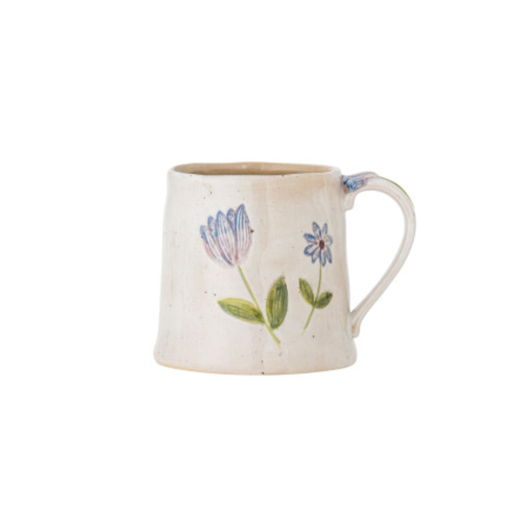 Den let spættede beige bund prydes af blomsterdetaljer i afdæmpede nuancer, og hvert krus har en reaktiv glasur. Små variationer i mønster og farvestyrke kan forekomme, så hvert krus er unikt.
