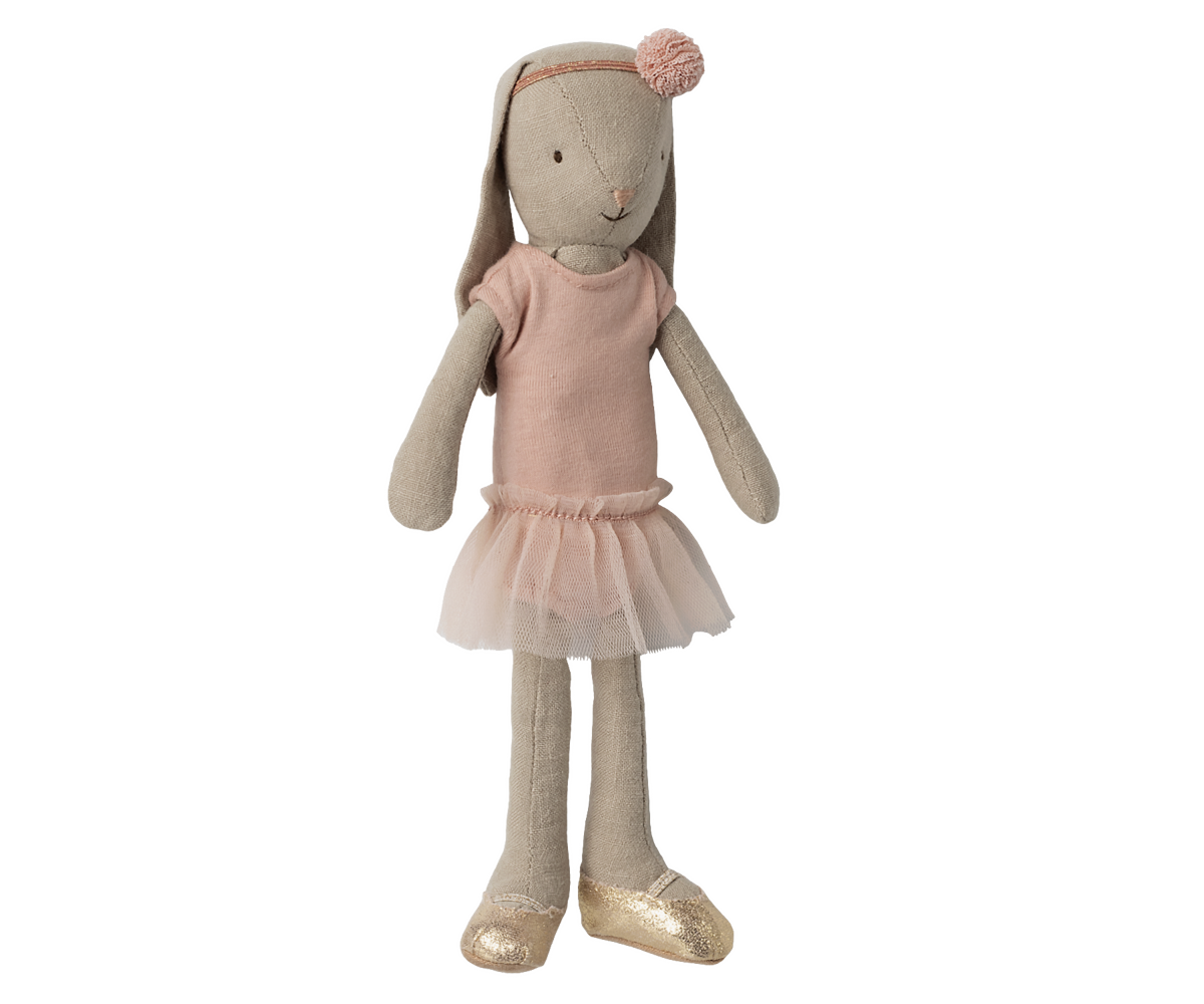Den velkendte Maileg kanin klædt som balletdanser. Den kommer i en rosafarvet balletdragt, tylskørt og balletsko.