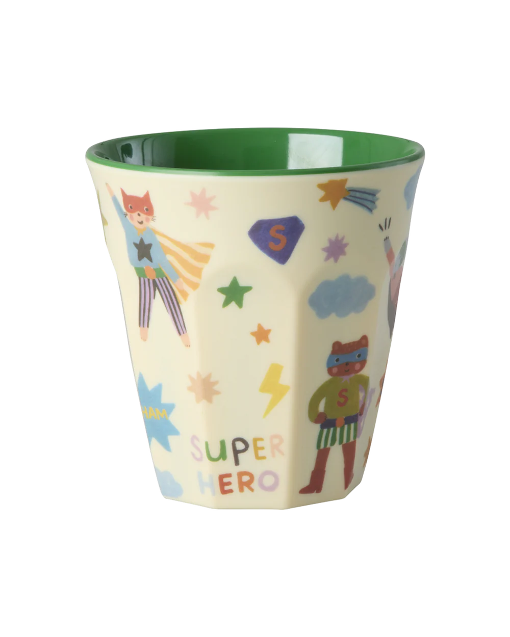 Nyd hvert et sip med vores grønne, mellem kop… den er fyldt med superhelte, stjerner og lyn og lavet er af det praktiske materiale melamin – helt perfekt til små nysgerrige hænder! Melamin er holdbart og ideelt til daglig brug på grund af dets styrke og lette rengøring. Vær opmærksom på, at produktet ikke er egnet til mikroovn.